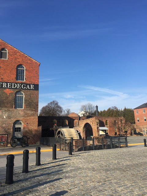 After our tour of Agecroft, the kids really wanted to get a closer look at the James River. I ducked back inside to ask our docent if she had any suggestions for us, and she immediately suggested we head to Tredegar Iron Works. She said we could take a tour of the Iron Works (and the American Civil War Center, if interested), as well as access the river from there. It was a lovely day to walk along the river and canal and to cross over to Brown's Island.